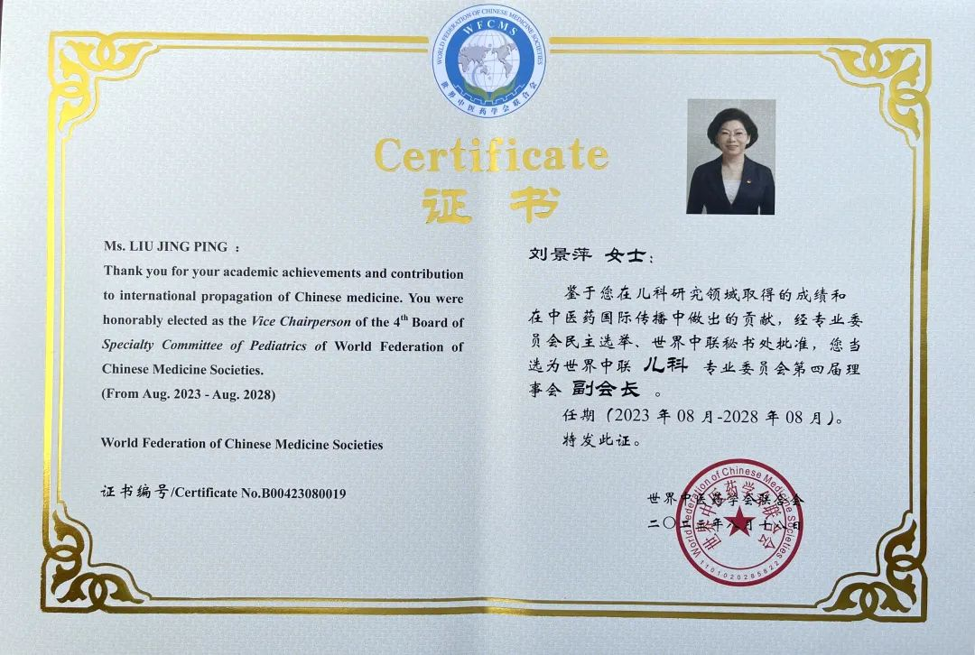 bc贷官网药业集团党委书记、董事长刘景萍当选世界中医药学会联合会儿科专业委员会第四届理事会副会长